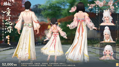 外观整体色调以柔粉、米白为主,辅以暖金、浅橙、柔红点缀,融入早春花饰元素与稚趣萌系纹样,面料轻盈垂顺,纹样精致细腻,既贴合盛唐雍容雅致的审美,又具有稚趣灵动的春日氛围。