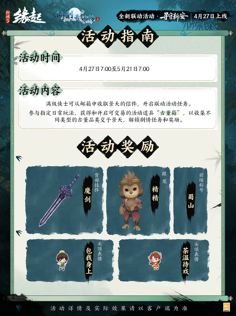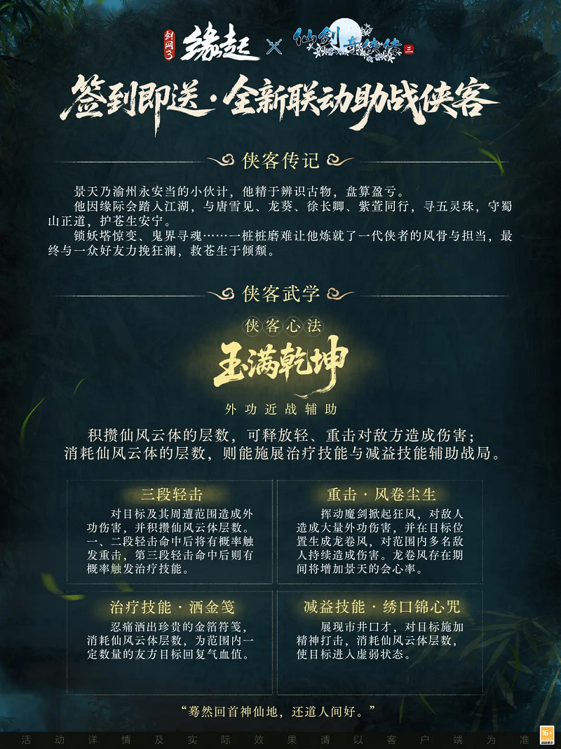 仙剑一梦越千载,侠义同辉入大唐。签到活动上线,海量联动福利免费解锁,仙剑经典角色景天化身助战侠客现身江湖,邀你并肩仗剑。