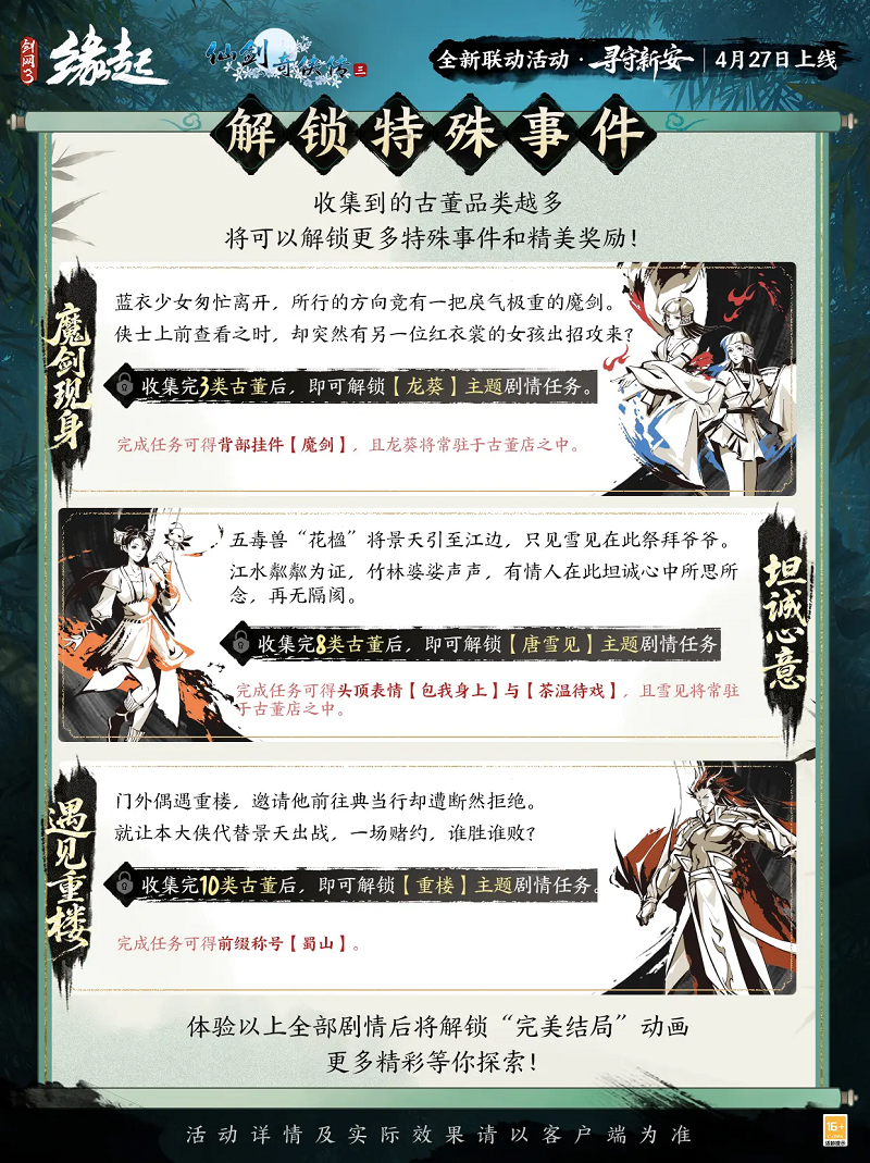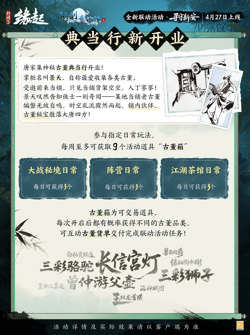 渝州故梦入大唐,新安典当聚侠踪!联动主题活动「寻守新安」开启。永安当掌柜景天现身唐家集新开古董典当行,诚邀侠士共寻奇珍,解锁仙剑经典角色专属剧情,海量限定好礼免费得。